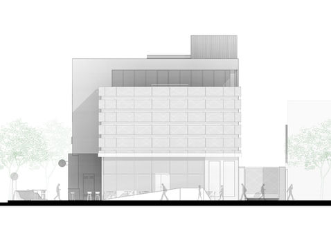 The upper floor, which houses the production and kitchen area, floats above a fully glazed ground floor dedicated to customer service. With blind walls that will eventually be covered in greenery to blend in with the surrounding trees, natural light filters through a coffered concrete and glass roof.