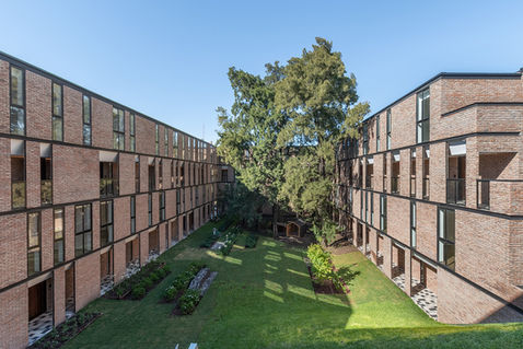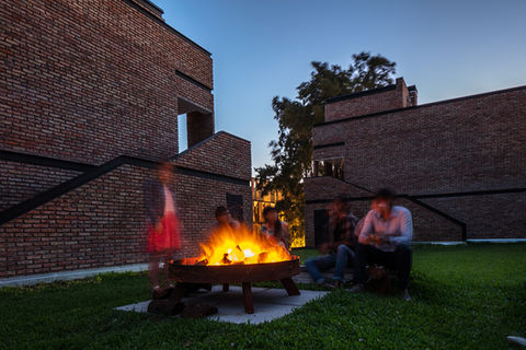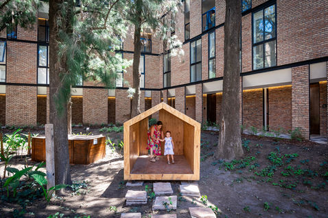 La planta del edificio es una reinterpretación de una forma tradicional de la arquitectura, el claustro, está diseñado siguiendo un riguroso módulo que es tratado luego de manera libre para otorgar movimiento y carácter al edificio. Si bien se maneja un vocabulario moderno, el lenguaje estético es vernacular, lo que facilita la construcción con mano de obra local acostumbrada a este tipo de trabajo. El ladrillo común con diferentes cocciones es utilizado a lo largo de toda la obra de diversos modos explotando sus cualidades expresivas. En el claustro se armó una plaza que aprovechó la vegetación existente y se presenta como un espacio público para todos los habitantes de la comunidad. La esquina norte está desmaterializada para permitir que la luz solar inunde el espacio central y una operación topográfica permite la continuidad espacial generando nuevas situaciones y espacialidades. El claustro es entendido como una de las formas arquitectónicas clásicas, sus partes y sus lógicas de construcción son reconfiguradas con un vocabulario moderno y respondiendo a necesidades particulares. Las galerías de circulación y las unidades abren hacia este patio central dotándolo de un carácter de verdadero espacio público para el encuentro de los habitantes.